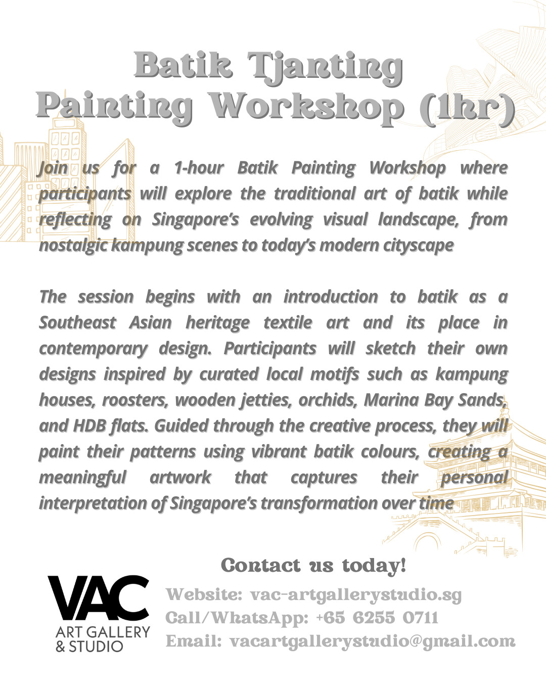 Join us for a 1-hour Batik Painting Workshop where participants will explore the traditional art of batik while reflecting on Singapore’s evolving visual landscape, from nostalgic kampung scenes to today’s modern cityscape