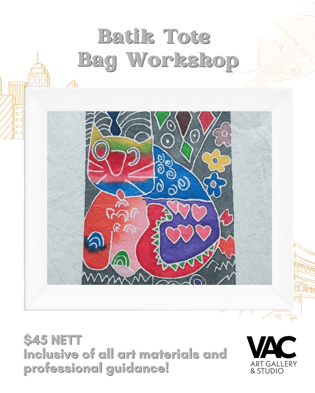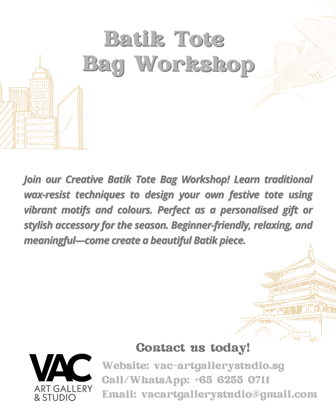 Join our Creative Batik Tote Bag Workshop! Learn traditional wax-resist techniques to design your own festive tote using vibrant motifs and colours. Perfect as a personalised gift or stylish accessory for the season. Beginner-friendly, relaxing, and meaningful—come create a beautiful Batik piece.